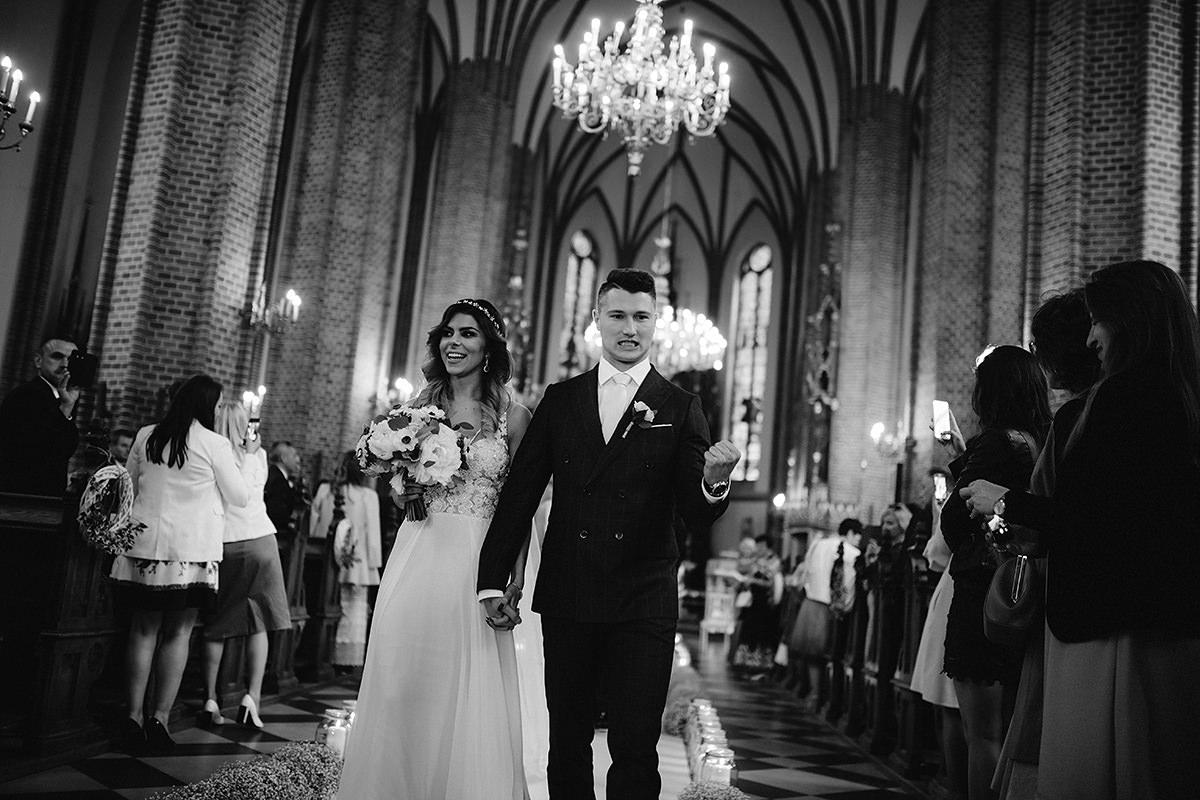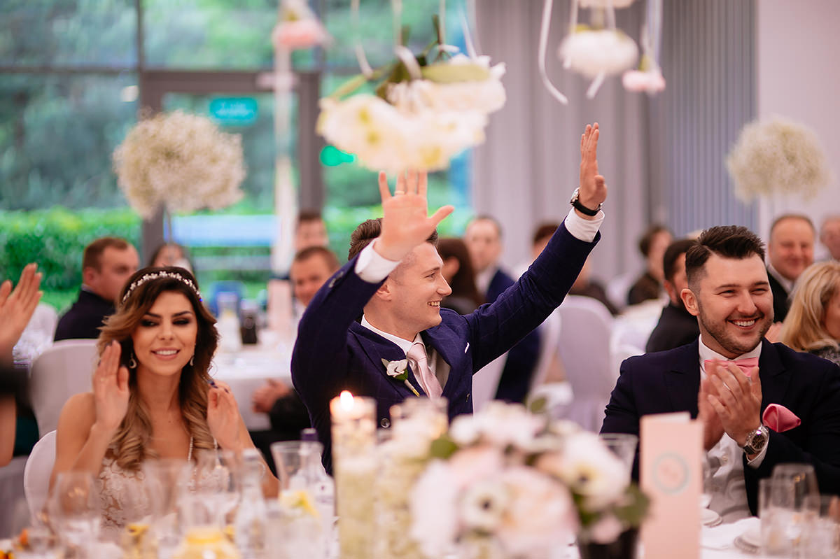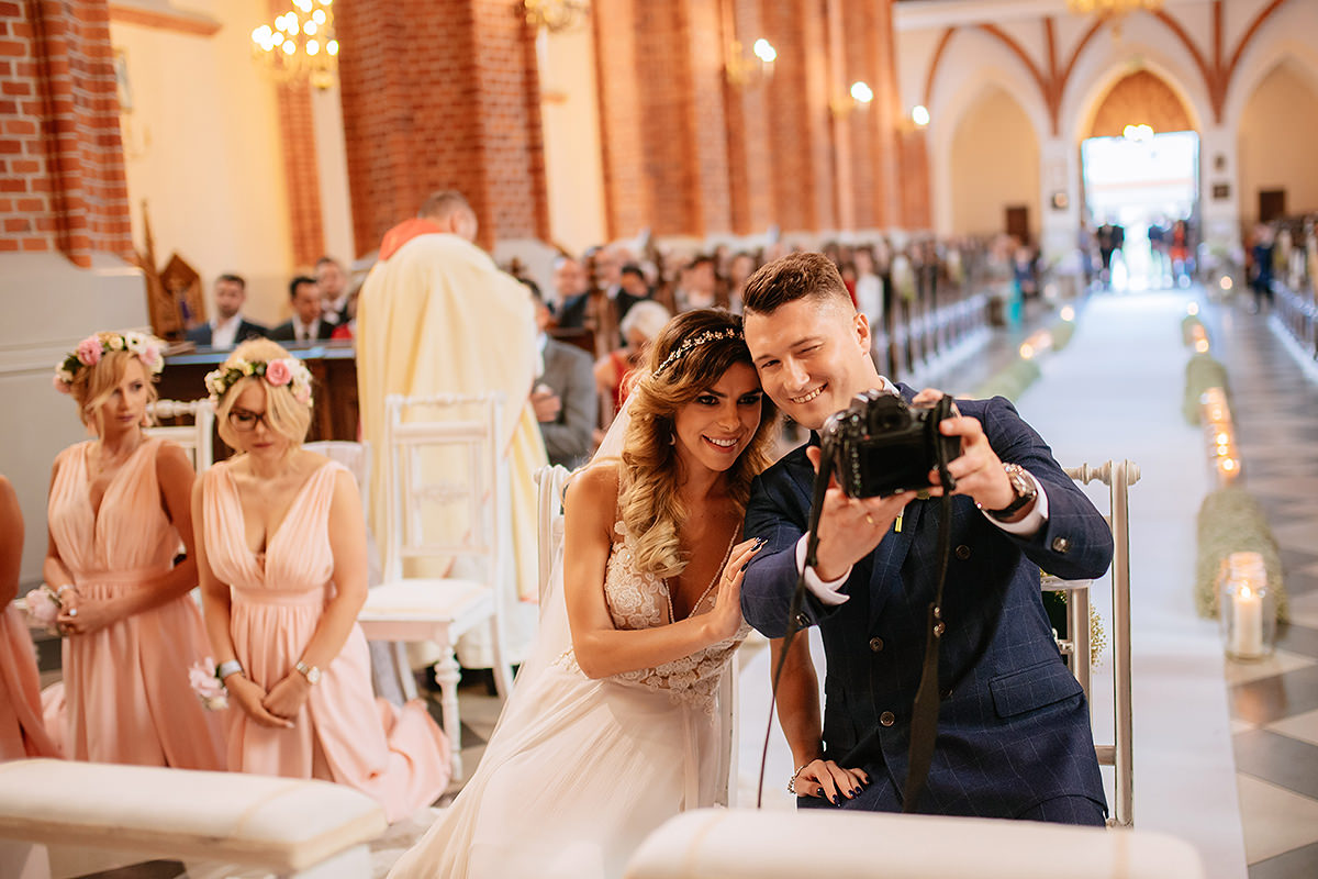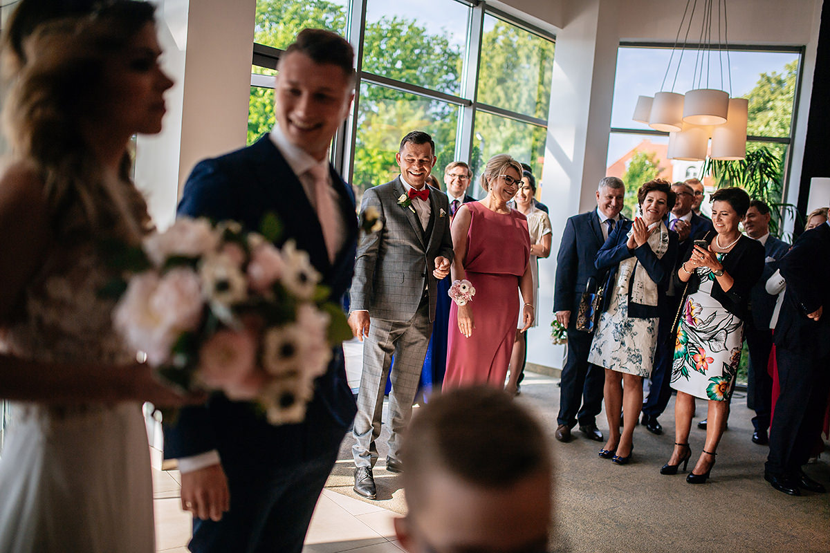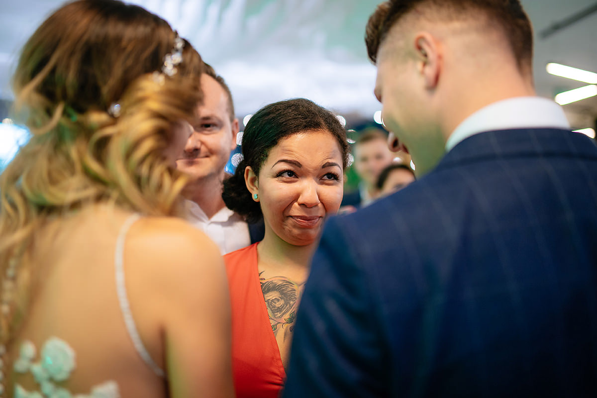 Następnie ceremonia z wesołą przysięgą. Dzięki takiej jednej literówce w trakcie wypowiadania ‚kluczowych’ słów ciśnienie spadło i banany z buziek już nie schodziły. Gest zwycięstwa i można było z powrotem wsiadać w ślubną niemiecką rakietę by popędzić na salę gdzie to działo się wieeeeele.